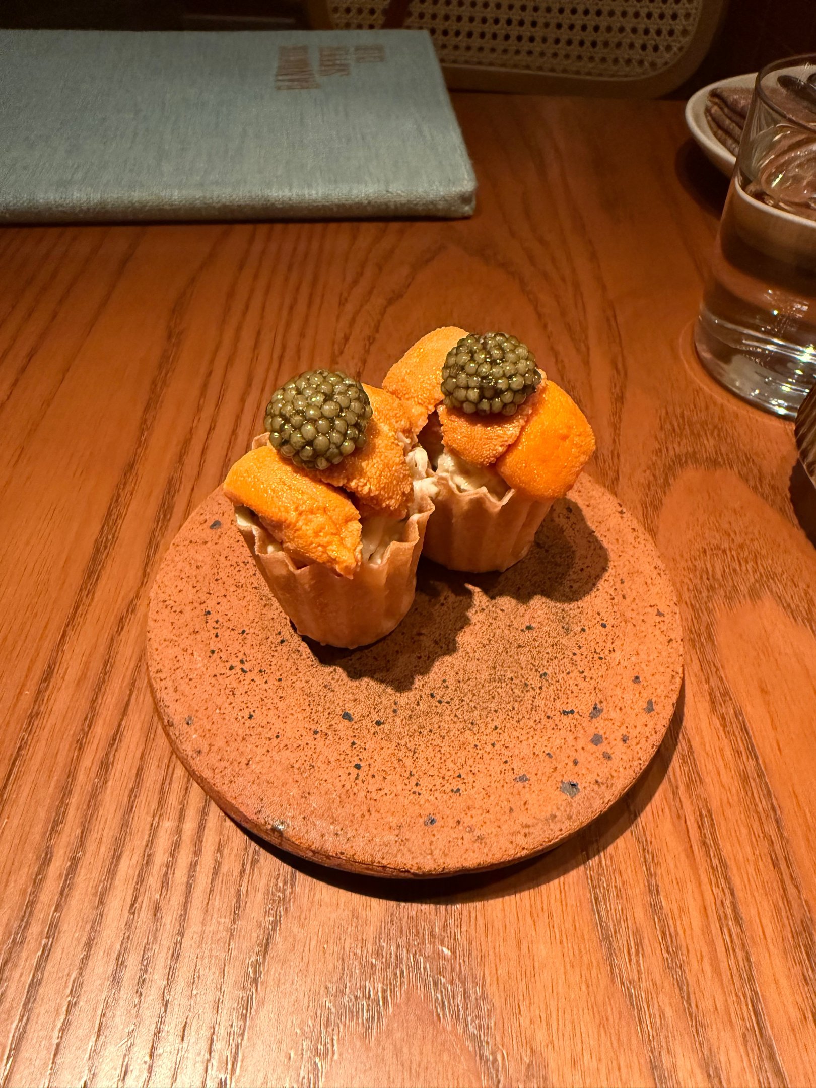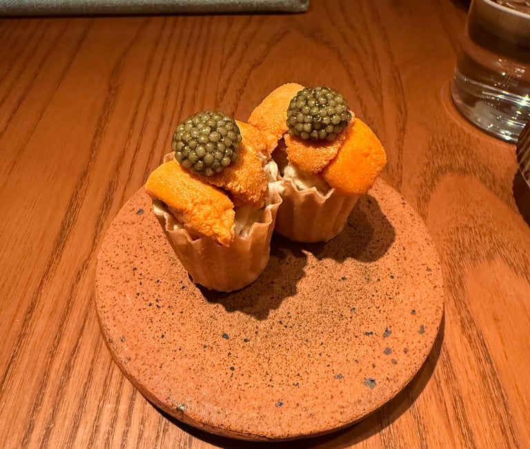 Top Row: Uni and Crab Tartlet, Khao Mun Gai, Pork Jowl ; Bottom Row: Beef Cheeks Massaman Curry, Bok Choy, Interior