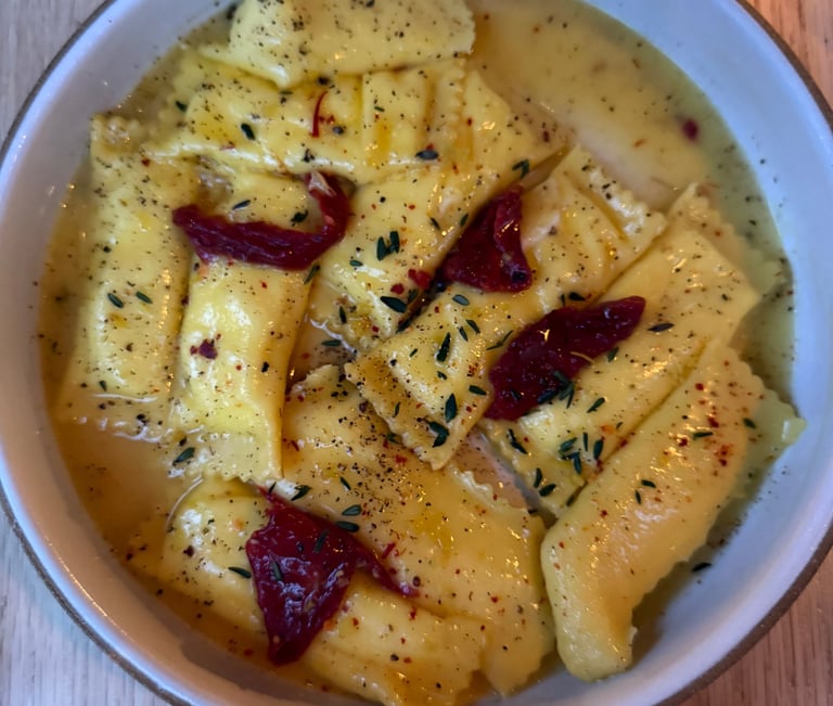 Top Row: Roasted Leek Focaccia with Green Garlic Butter; Cacio e Pepe Frittelle; Grilled Scallops || Bottom Row: Ricotta Gnocchi; Sheep’s Milk Cheese Agnolotti; Apple Crostata